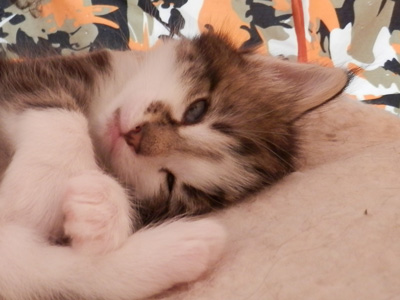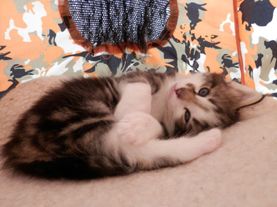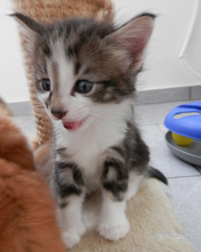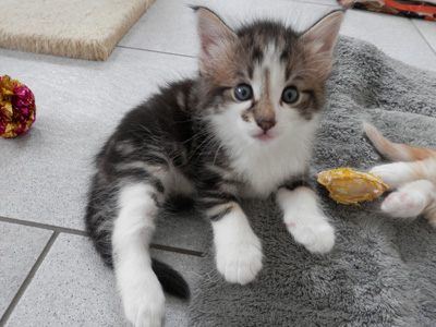 Farbe: black tabby gestromt mit weiss (Bicolor) (n 03 22) Mutter: S*Mar'Michels Gavarani Gold (f 03 22) Vater: S*Segersjös Leezak (ns 03 22) Züchter: Ursula Habegger & Ivo Stadler, Schattdorf UR
